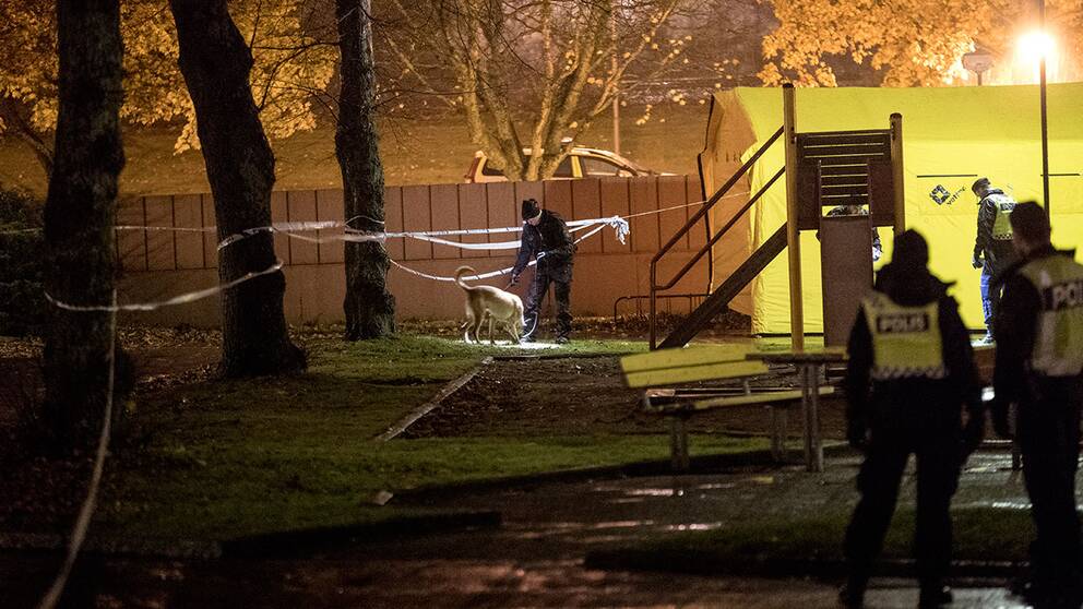 Polisen vid biskopsgården i göteborg efter att en polis blivit skjuten till döds.